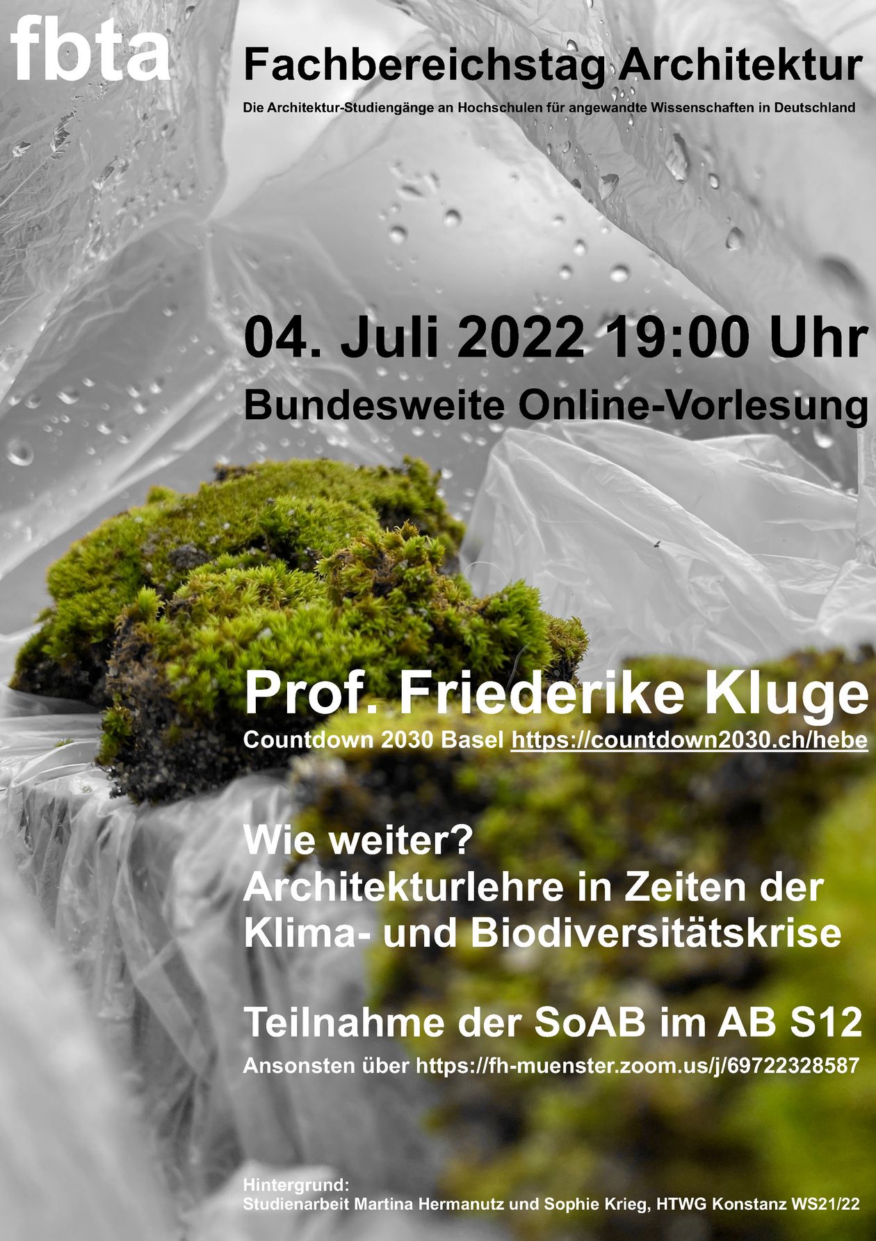 Wie weiter? Architekturlehre in Zeiten der Klima- und BiodiversitätskriseBundesweite Online-Vorlesung von Prof. Friederike Kluge am 04. Juli 2022 um 19:00 Uhr als Zoom-Veranstaltung.