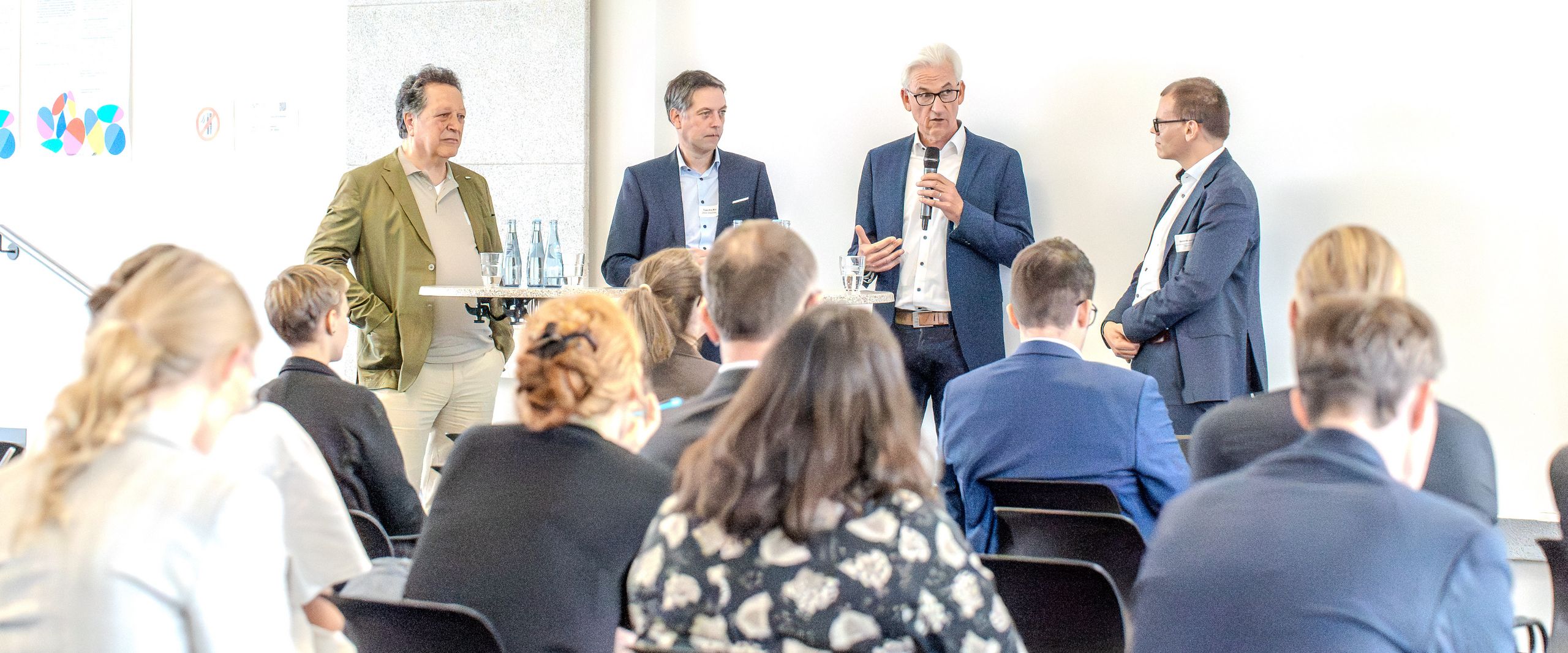 Die abschließende Podiumsdiskussion mit Staatsrat Jan Fries (Senatorin für Umwelt, Klima und Wissenschaft), Philipp Metz (ErdwärmeDich Anergienetze eG), Prof. Dr. Sascha Koch (Jade Hochschule) sowie Lothar Nolte (Klimaschutz- und Energieagentur Niedersache – KEAN) reflektierte das breite Spektrum von Forschungsergebnissen, das am Ende des Projekts WWNW im November 2025 für eine Umsetzung bereitsteht. „Den Wissens- und Technologietransfer, Bildungsformate für nachhaltige Entwicklung und den Transfer ins Handwerk haben wir bereits innerhalb des Projekts als Querschnittsaufgaben vorangetrieben. Durch Folgeaktivitäten der Verbundpartner:innen und den Transfer gemeinsam mit den beteiligten Mitarbeitenden werden die entwickelten Technologien qualifiziert installiert, betrieben und weiterentwickelt“ betonte Prof. Dr. Sascha Koch. „Das Vorhaben realisiert damit nicht nur deutschlandweit einmalig umfänglich das Thema Wärmewende, sondern stellt eine Übertragbarkeit auf andere Regionen und weitere Technologien und Anwendungsfelder sicher“, resümierte Staatsrat Jan Fries die zukunftsweisenden Forschungsergebnisse des Gesamtkonsortiums WWNW.