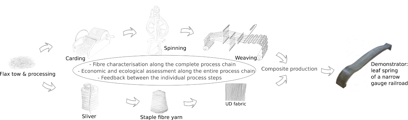 So konnte die komplette Prozesskette von der Rohfaser und Faseraufbereitung (SachsenLeinen GmbH & BAFA Neu GmbH) zum Garn (Institut für Textiltechnik an der RWTH Aachen – ITA) und Gewebe (Wenzel & Hoos GmbH) bis zum Verbundwerkstoff (INVENT GmbH & NOVACOM Verstärkte Kunststoffe GmbH) und zum Demonstrator-Bauteil abgedeckt werden. Die Hochschule Bremen koordinierte das Gesamtvorhaben, das aus drei Teilprojekten bestand, und beschäftigte sich mit der Charakterisierung der Fasern und Verbundwerkstoffe. „Am Ende des Projekts war es uns möglich aus den entwickelten Bastfaserhalbzeugen eine Blattfeder für ein Drehgestell einer Schmalspurbahn zu fertigen, die konventionell aus Glasfaser-verstärkten Kunststoffen hergestellt wird.“ beschreibt Dr. Nina Graupner den Erfolg des Projektes.