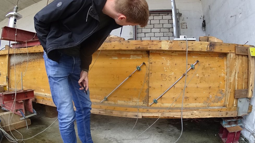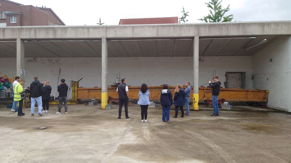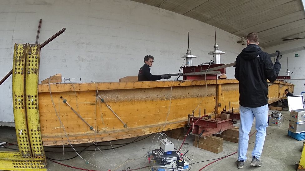 Für die Studierenden die einmalige Gelegenheit, einen Holz-Träger kontrolliert bis zum Bruch zu testen. Versuchsplanung und -durchführung waren selbständig zu erbringen, angeleitet von den Expert:innen am Institut für Experimentelle Statik. Da die Abteilung Bau- und Umwelt über keine Versuchshalle verfügt, wurde Dank Unterstützung der Überseeinsel GmbH ein temporärer Versuchsstand auf dem Hachez-Gelände konzipiert und aufgebaut.