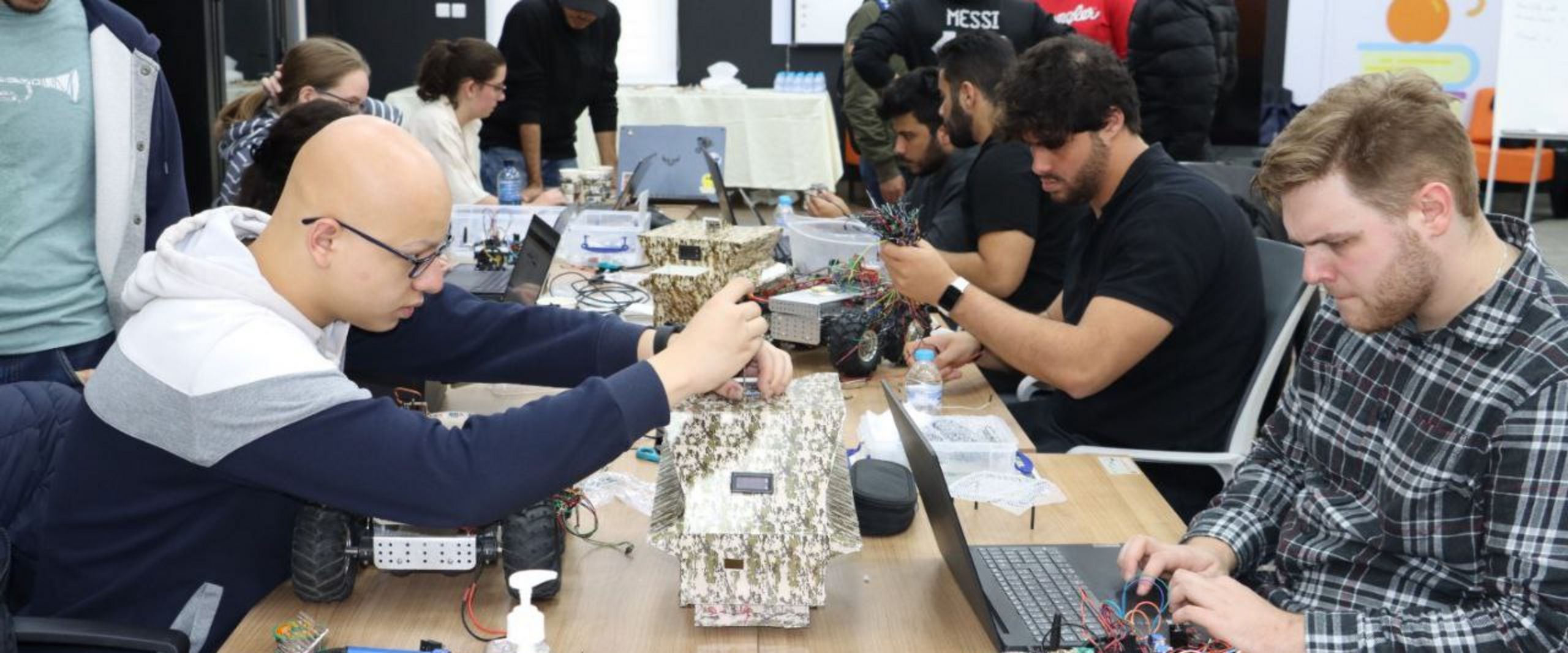 Im diesjährigen Projekt entwickelten die Studierenden Lösungen für aktuelle gesellschaftliche Problemstellungen durch Embedded Robotics. Vorgegebene Zielsetzung war es, einen kooperativen Roboterschwarm zu realisieren, der als Gruppe komplexe Aufgaben lösen kann. Zur Kommunikation der Roboter wählten die Studierenden eine drahtlose Funkverbindung mit Lora-Technologie. Am Ende des Projektes präsentierten die Gruppen in Amman verschiedene Anwendungsbeispiele des Konzeptes. So zeigte eine Gruppe ein Roboterpaar, das in Erdbebengebieten nach Vermissten suchen kann und sich dabei gegenseitig unterstützt.