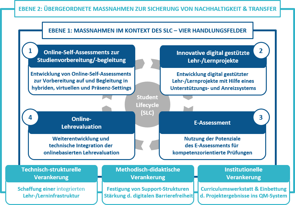 Um die dargestellten Handlungsfelder nachhaltig zu verankern, sind folgende übergeordnete Maßnahmen, die vor allem der Schaffung und Weiterentwicklung technisch-struktureller Voraussetzungen, aber auch dem Ausbau bestehender Strukturen zur methodisch-didaktischen und institutionellen Verankerung der Projektergebnisse dienen, projektimmanent angelegt. Sie dienen als Rahmung der angestrebten Maßnahmen im Kontext des Student Life Cycles (Ebene 1) und damit als Fundament eines integrierten Ansatzes der digitalen Innovation von Studium und Lehre an der HSB.