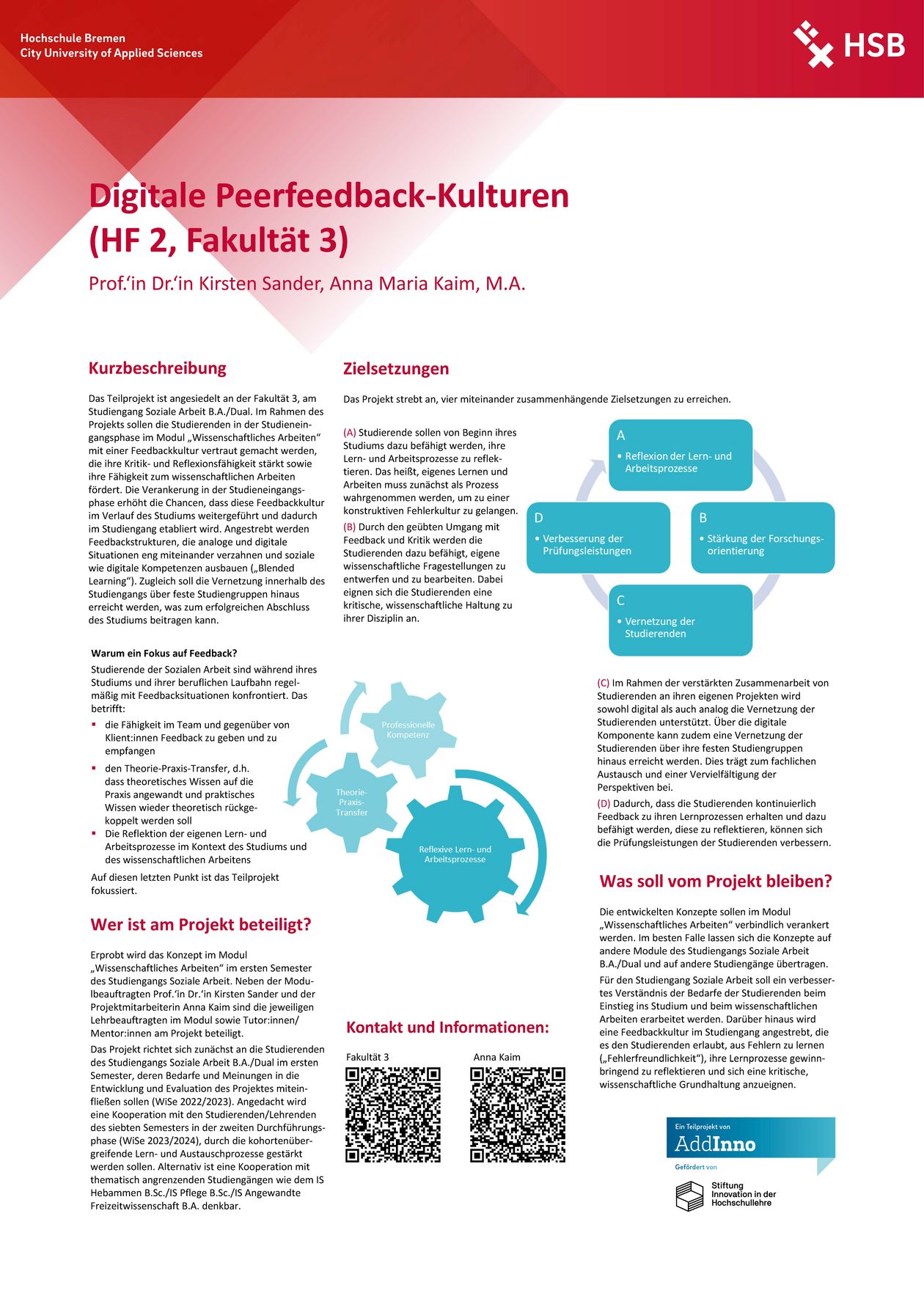 Im Rahmen des Projekts sollen die Studierenden in der Studieneingangsphase im Modul „Wissenschaftliches Arbeiten“ mit einer differenzsensiblen Feedbackkultur vertraut gemacht werden, die ihre Kritik- und Reflexionsfähigkeit stärkt sowie ihre Fähigkeiten zum wissenschaftlichen Arbeiten fördert. Unterstützt wird das Projekt durch Tutor:innen, die die Etablierung einer Feedbackkultur auf Peer-Ebene unterstützen und bei Fragen des wissenschaftlichen Arbeitens weiterhelfen. Das Teilprojekt ist angesiedelt an der Fakultät 3, am Studiengang Soziale Arbeit B.A./Dual. In der letzten Projektphase sollen Teile des Konzepts auf andere Studiengänge an der Fakultät 3 übertragen werden.
