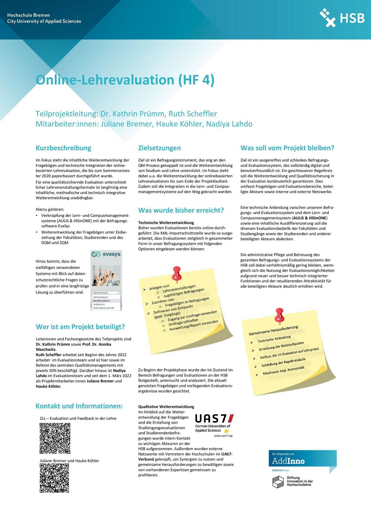 Für eine qualitätssichernde Evaluation unterschiedlicher Lehrveranstaltungsformate ist langfristig eine inhaltliche und methodische Weiterentwicklung unabdingbar und die Verknüpfung der Lern- und Campusmanagementsysteme mit der Befragungssoftware evasys für die HSB ein innovativer Ansatz. Die Regelkreisläufe der Lehrveranstaltungsevaluation sollen geschlossen werden und die Ergebnisse in den Qualitätsmanagement-Zyklus der HSB einfließen.