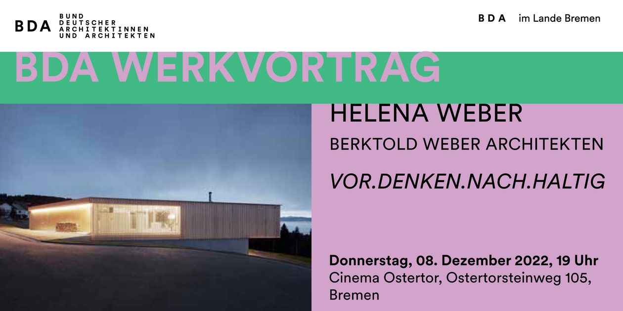 BDA-Werkvortrag VOR.DENKEN.NACH.HALTIG von Helena Weber / Berktold Weber Architekten am Donnerstag,den 08.Dezember um 19 Uhr im Cinema Ostertor.