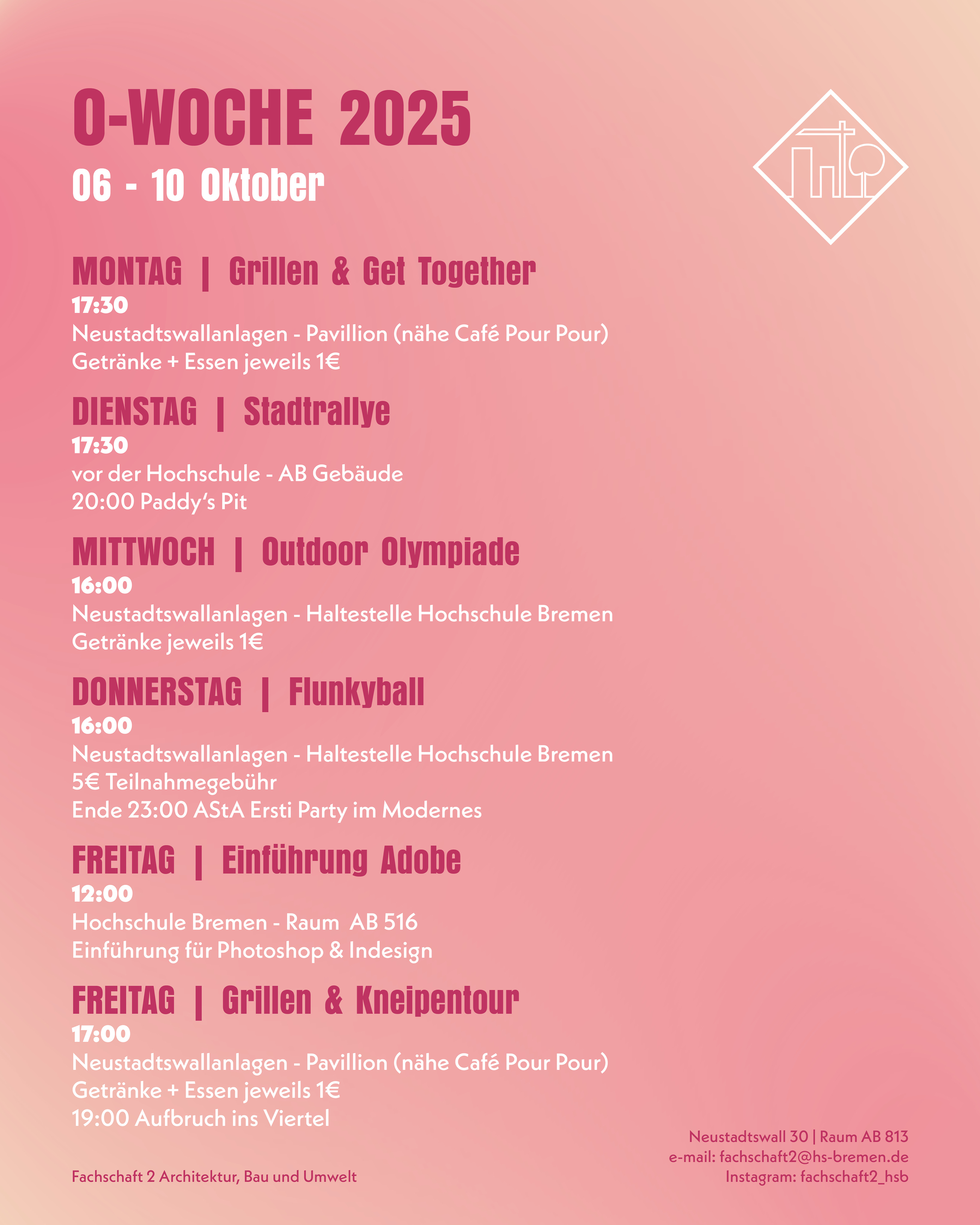 Wir haben für Sie ein Programm für die erste Semesterwoche vom 06.10. - 10.10.2025 vorbereitet. Den genauen Ablauf der Woche und alle aktuellen Informationen finden Sie im Oktober auf unserer Homepage sowie auf Instagram. Wir bitten Sie, so bald wie möglich Ihre Hochschul-Emailadresse zu aktivieren, damit wir Sie auch darüber erreichen können.