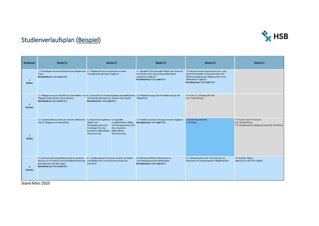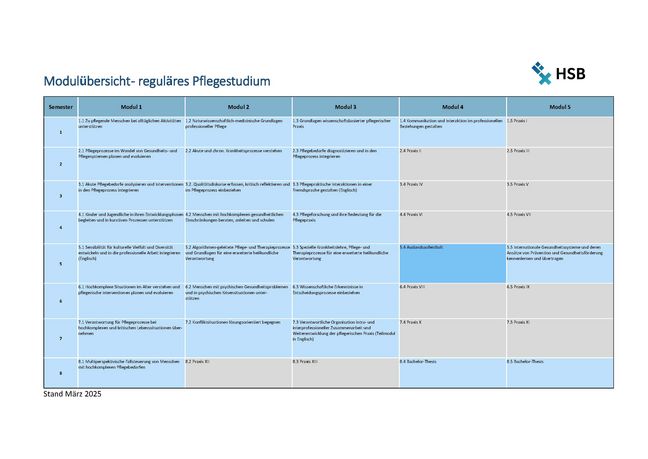 Das Pflegestudium umfasst in 8 Semestern 40 Module (jeweils 6 ECTS) wovon 13 Module in der Praxis absolviert werden.
