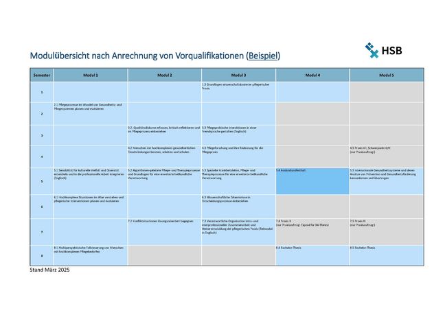 Diese Modulübersicht zeigt die noch zu absolvierenden Module nach der Anrechnung der Vorqualifikation durch eine abgeschlossene 3-jährigen generalistischen Pflegeausbildung als Pflegefachperson/-frau/-mann.