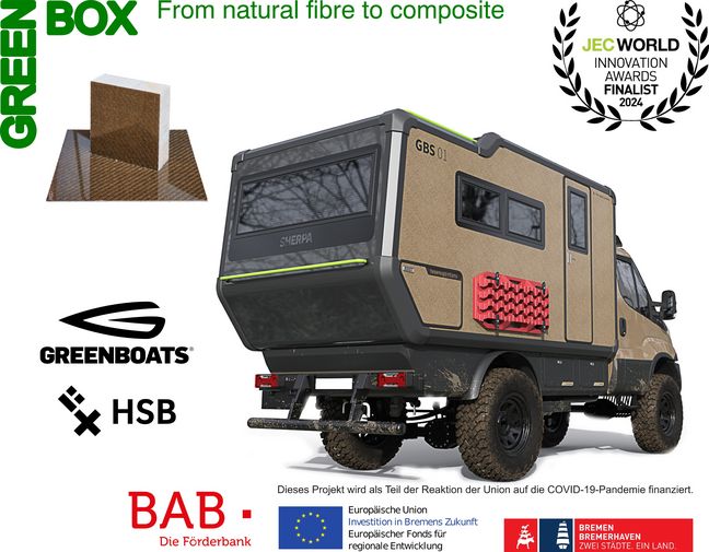 Lightweight design, especially with natural fibre-reinforced composites, is essential to match sustainability demands within the mobility sector. Lightweight construction methods such as the established sandwich structure in combination with bio-based natural fibre-reinforced composite materials are of great relevance, which should represent an alternative to established metallic structures or glass fibre-reinforced petrochemical composite structures. In the GreenBox project, natural fibre-reinforced sandwich structures are being developed and manufacturing processes optimised for scalable industrial series production. This is being pursued to reduce the environmental impact on several levels and take a step towards sustainable mobility.