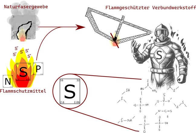 The Europe-wide ban on halogenated flame retardants (FSM), combined with increased flame-retardancy requirements for textiles, plastics, and fibre composites, has led to considerable interest in effective, halogen-free alternatives. The problems with current and new halogen-free FRMs are their low flame retardancy, the quantity required to achieve adequate protection, which affects mechanical properties, and poor wash resistance. The use of sulfur-containing compounds in polymers shows promising results in terms of flame retardancy, which can be improved by the synergistic effect of nitrogen and phosphorus. The project focuses on developing sulfur-containing FSMs for bio-based fibre composites. The development goal is to create efficient systems with performance comparable to halogenated FSMs, which are characterised by good flame retardancy, low mass requirements, and high permanence. Among other things, the project addresses the toxicological and environmental hazards of common halogenated flame retardants and identifies more efficient alternatives. Ideally, the materials' mechanical properties will be improved.