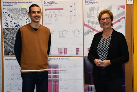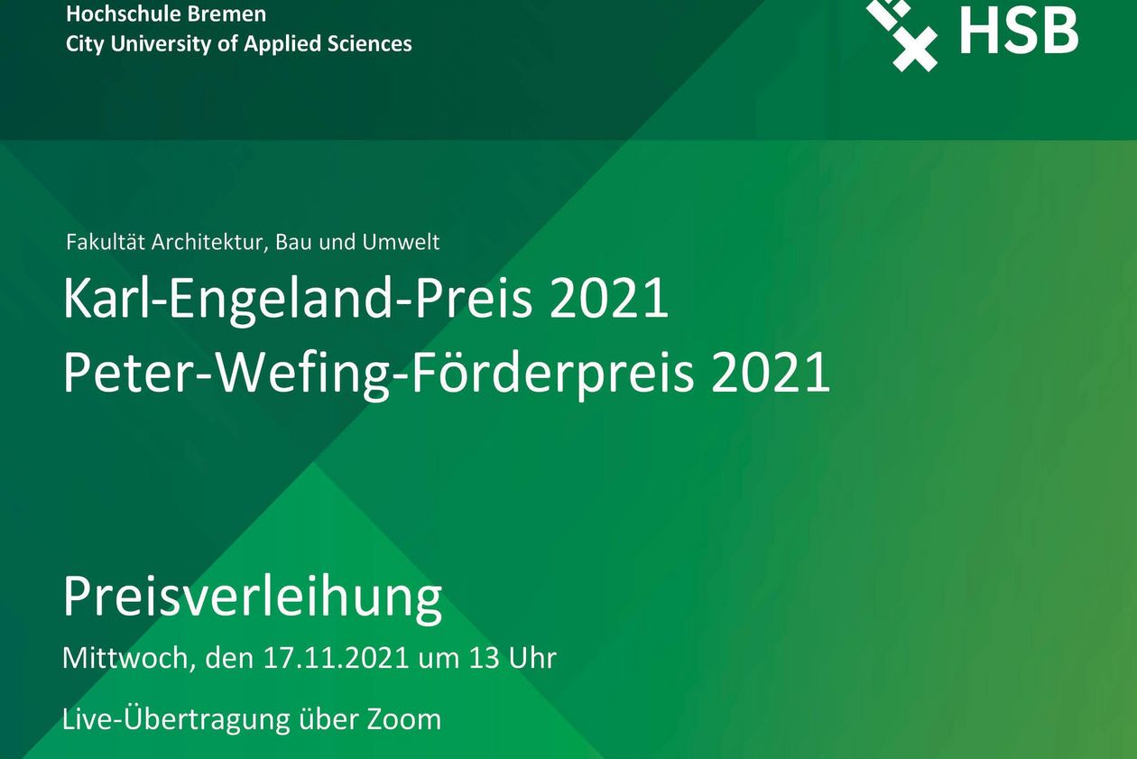 On 17 November 2021, the Faculty of Architecture, Building and the Environment at Bremen University of Applied Sciences awarded seven outstanding student projects with this year's Karl Engeland Prize and Peter Wefing Sponsorship Prize in an award ceremony that was broadcast online. Due to the coronalage, this year the study prizes were not awarded during the first semester welcome ceremony, but were presented by Vice Dean Prof. Dr. Silke Eckardt in a small ceremony with relatives, members of the jury and the supervisors. "Mobility concepts, modular timber construction, façade utilisation, garden cities: the award-winning theses reflect the prize-worthy commitment of the prize-winners to ecological and resource-saving building in Bremen. The prizes are intended above all to spur the first-year students on to ambitious achievements in a successful course of study," emphasised Silke Eckardt.