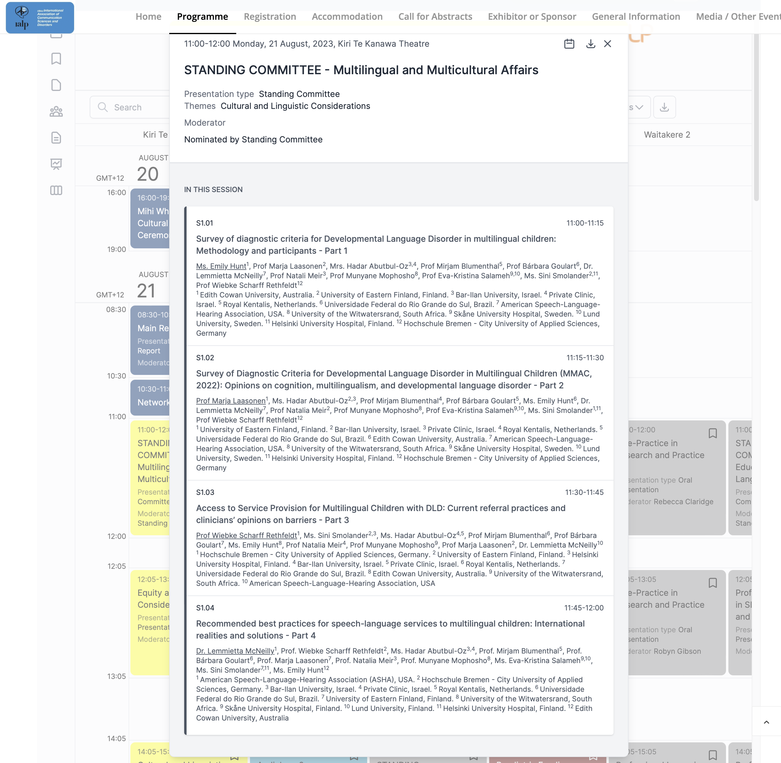 Hunt, E., Laasonen, M., Abutbul-Oz, H., Blumenthal, M., Goulart, B., Hunt, E., McNeilly, L., Meir, N., Mophosho, M., Salameh, E.-K., Smolander, S., Scharff Rethfeldt, W. (2023, August 20-24). Survey of diagnostic criteria for Developmental Language Disorder in multilingual children: Methodology and participants - Part 1. Oral presentation. 32nd World Congress of the IALP, Auckland, New Zealand (program)