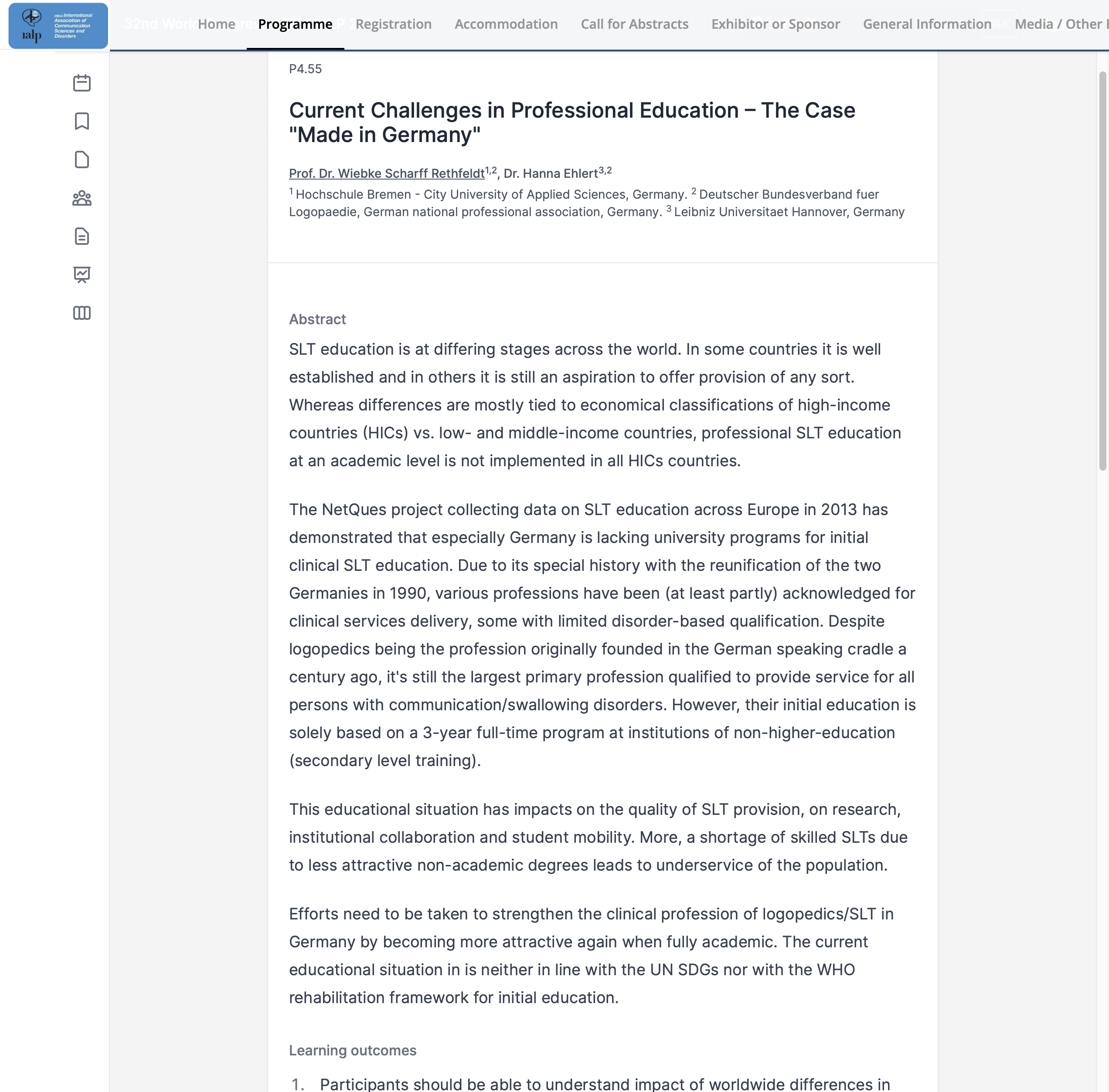 Scharff Rethfeldt, W. & Ehlert, H. (2023, August 20-24). Current Challenges in Professional Education: The Case "Made in Germany". Poster presentation. 32nd World Congress of the IALP, Auckland, New Zealand (program)