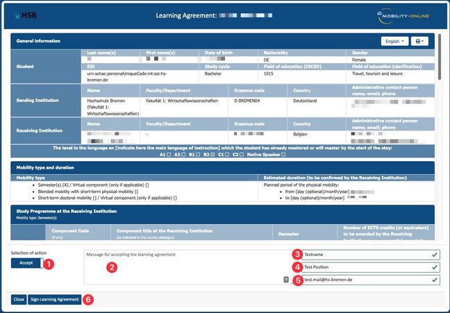 Nach der Unterschrift der Studierenden erhalten Sie eine automatische E-Mail mit einem Link zum digitalen Learning Agreement (dLA) im System Mobility-Online. Über diesen Link gelangen Sie direkt zur Ansicht des betreffenden Learning Agreements. In dieser Ansicht können Sie das Learning Agreement überprüfen und entweder genehmigen oder ablehnen.