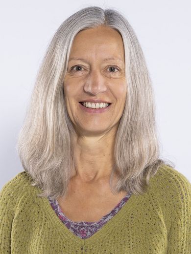 Auf dem Bild ist Sabine Ganter zusehen. Sie hat kurzes graues lockiges Haar und trägt ein weißes T-Shirt unter einem blauen Blazer.