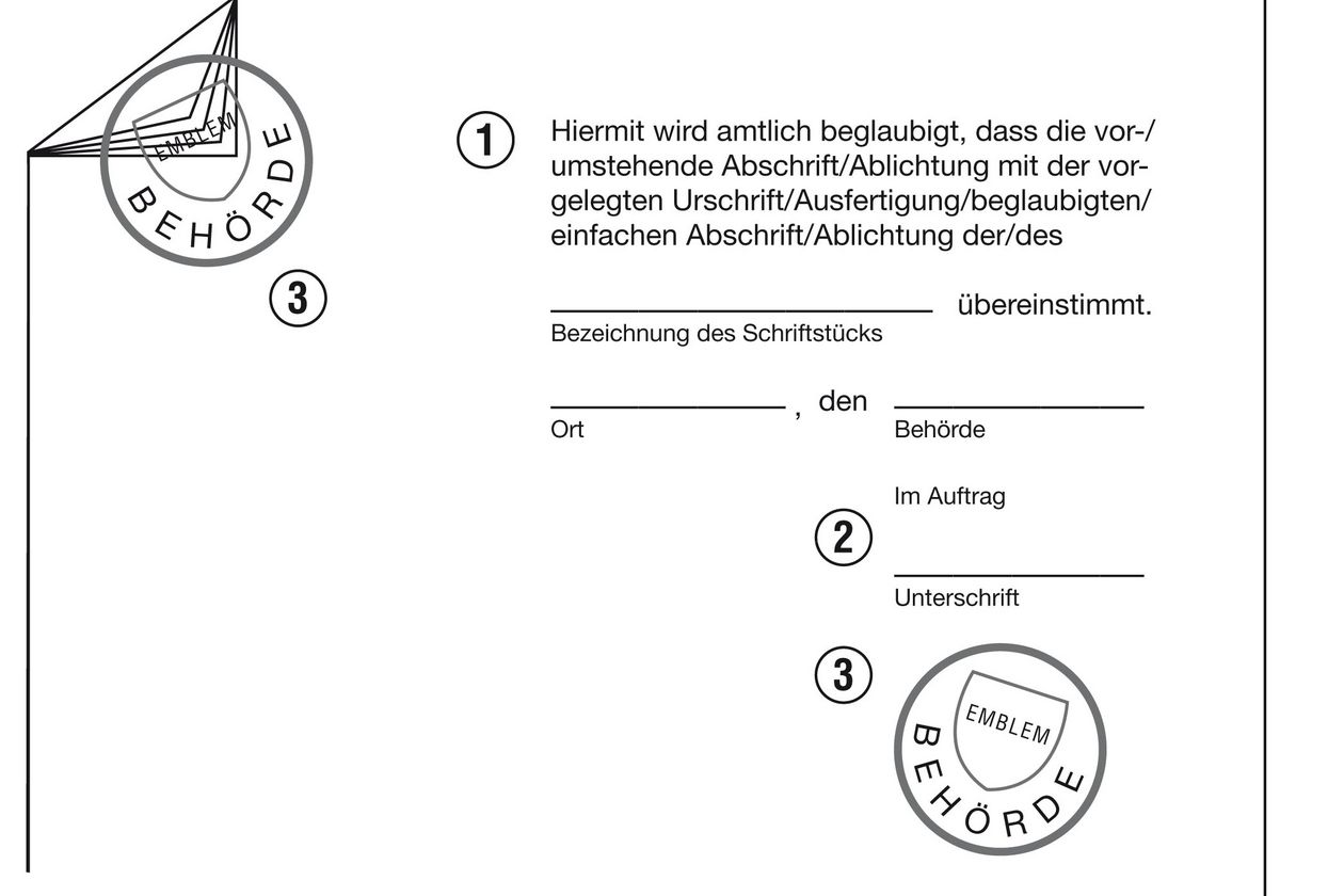 Stempel und Unterschriften müssen originär auf der amtlich beglaubigten Kopie aufgebracht sein. (vgl. Grafik)